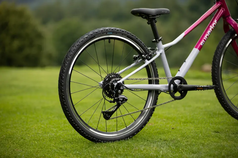 - Shimano 1x8-vaihteinen vaihteisto laajalla välitys-skaalalla. Lapsen helposti käytettävä Shimano 8-vaihteinen Revo Shift vaihteisto, jota pyöritetään.